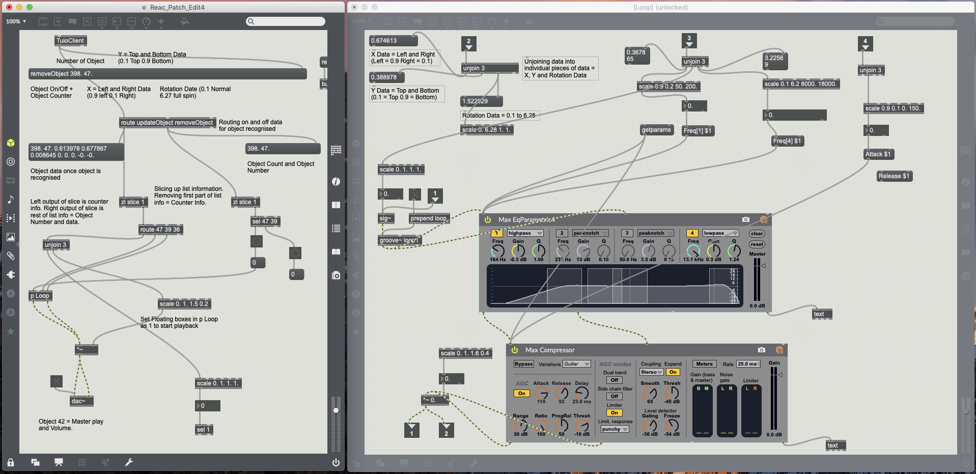 Now that the list data from the TuioClient has been processed I am now able to use the markers X, Y and rotation data to control various objects within max. I have built the various controls within different sub-patches. By using the encapsulate command a sub-patch will be created grouping objects together and saving space within the main patcher window (Cycling74, 2019) (see Fig.3.2.).