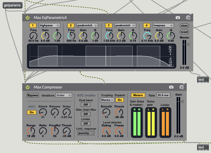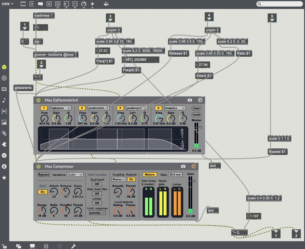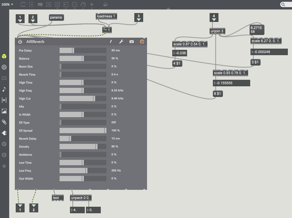 The amxd~ object is used to load a Max for Live object and covers a range of plug-ins from reverb to compression (Cycling74, 2019). In order for these plug-ins to work with the data being sent from the TuioClient, you first need to know which parameters of the plug-ins are controllable. Using the message “getparams” will send a list of all the plug-in parameters to the far right output of amxd~, this can be read using a text object, which will collate and formate the message into a line of data (Cycling74, 2019) (see Fig.4.2.).