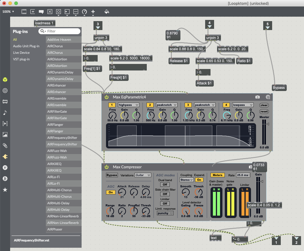 Max allows users to work with built in audio units, as well as, a users own audio plugins which are already installed on their computer (see Fig.4.1.).