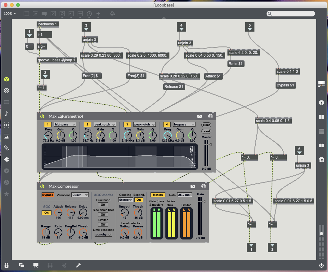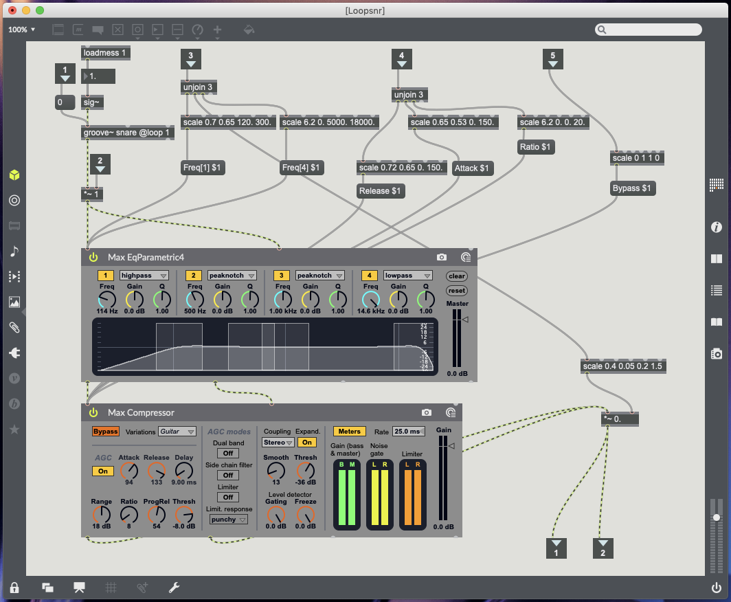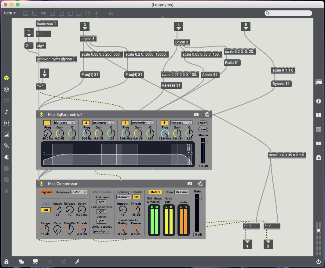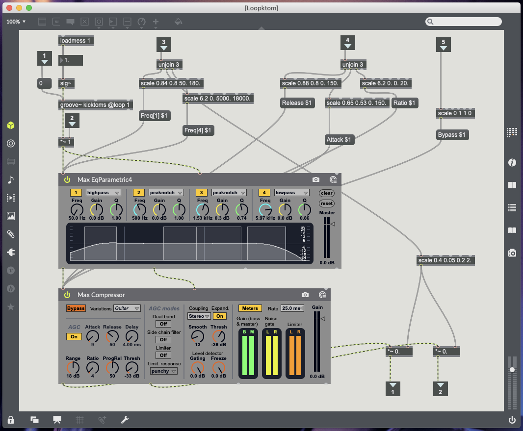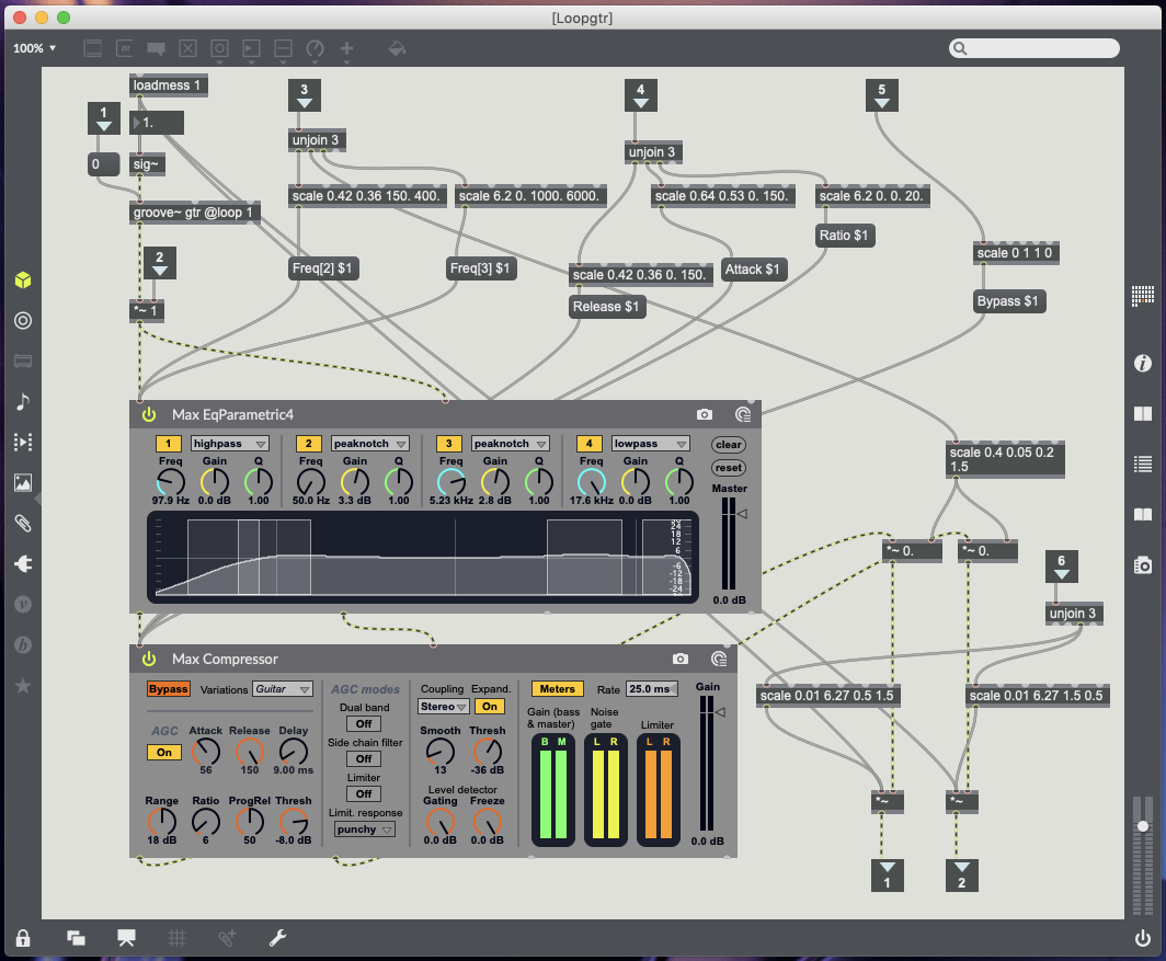 30 – Guitar – Update Object sends 1 to volume to turn mute off, Remove Object sends o to volume to turn mute on (post Groove object pre plugins), X data controls EQ peak notch (+3db) between 150Hz and 400Hz, Y data controls volume, Rotation controls EQ peak notch (+3db) between 1000kHz and 6000kHz (see Fig 5.6.).