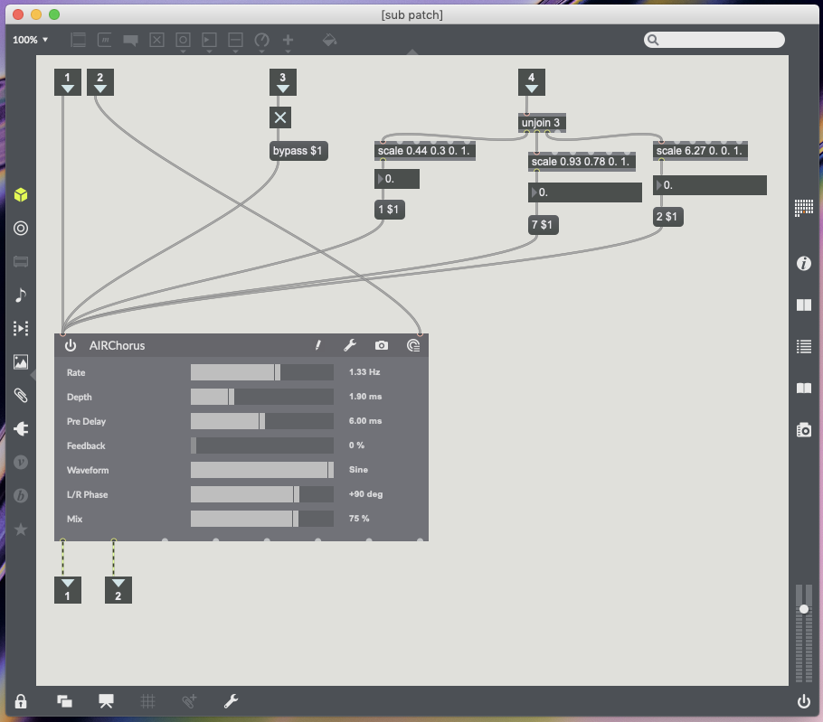 Max allows users to work with built in audio units, as well as, a users own audio plugins which are already installed on their computer (see Fig.4.1.).