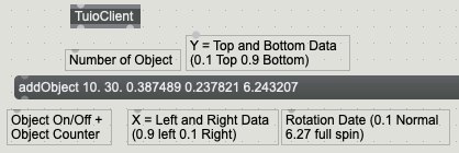 Fiducial markers are placed on a translucent table top and beneath the table a camera captures images. These images are processed and determine the identity, orientation and location of individual fiducial markers (Bencina and Kaltenbrunner, 2005). The data that is captured is translated into floating point number data (see Fig2.3.). This floating point data is what I can use to control other object parameters within Max.