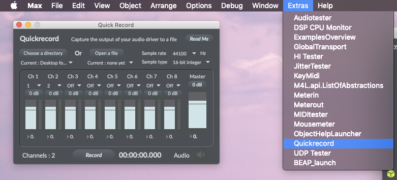 The last feature I wanted from this patch was the option to record the the mix being created in Logic Pro X or any DAW Soundflower is an audio driver, created by Cyling74, which can be used to route audio between different computer applications by creating a virtual audio interface (Lee, 2013). Soundflower is a useful tool to have installed on your system, however, I have found on my computer there is a compatibility issue. All audio becomes glitchy once Soundflower is activated and any recordings made will have these glitches. Unable to find a fix, which is likely due to the age of the driver, the best alternative is already built into Max. Max has a quick record function which allows you to record from selected audio outputs (Cycling’74, 2011) (see Fig.5.10.). Once your session has been recorded you can import the audio file into any DAW.