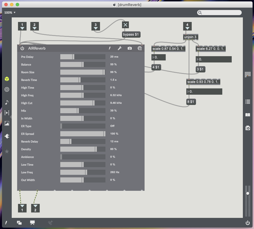 The amxd~ object is used to load a Max for Live object and covers a range of plug-ins from reverb to compression (Cycling74, 2019). In order for these plug-ins to work with the data being sent from the TuioClient, you first need to know which parameters of the plug-ins are controllable. Using the message “getparams” will send a list of all the plug-in parameters to the far right output of amxd~, this can be read using a text object, which will collate and formate the message into a line of data (Cycling74, 2019) (see Fig.4.2.).